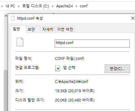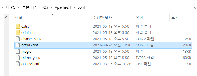 그리고 C://Apache24/conf 에서 httpd.conf를 수정해야한다.